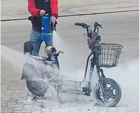 面对日益频发的电动车锂电池火灾,演练设置了专项模拟。锂电池瞬间爆燃,火势凶猛。工作人员使用 圣辉DTE大容量锂电池专用灭火装置 进行强攻,成功压制并扑灭了极具危险性和复燃性的锂电池火灾,生动诠释了“专业问题需专业方案解决”的理念。