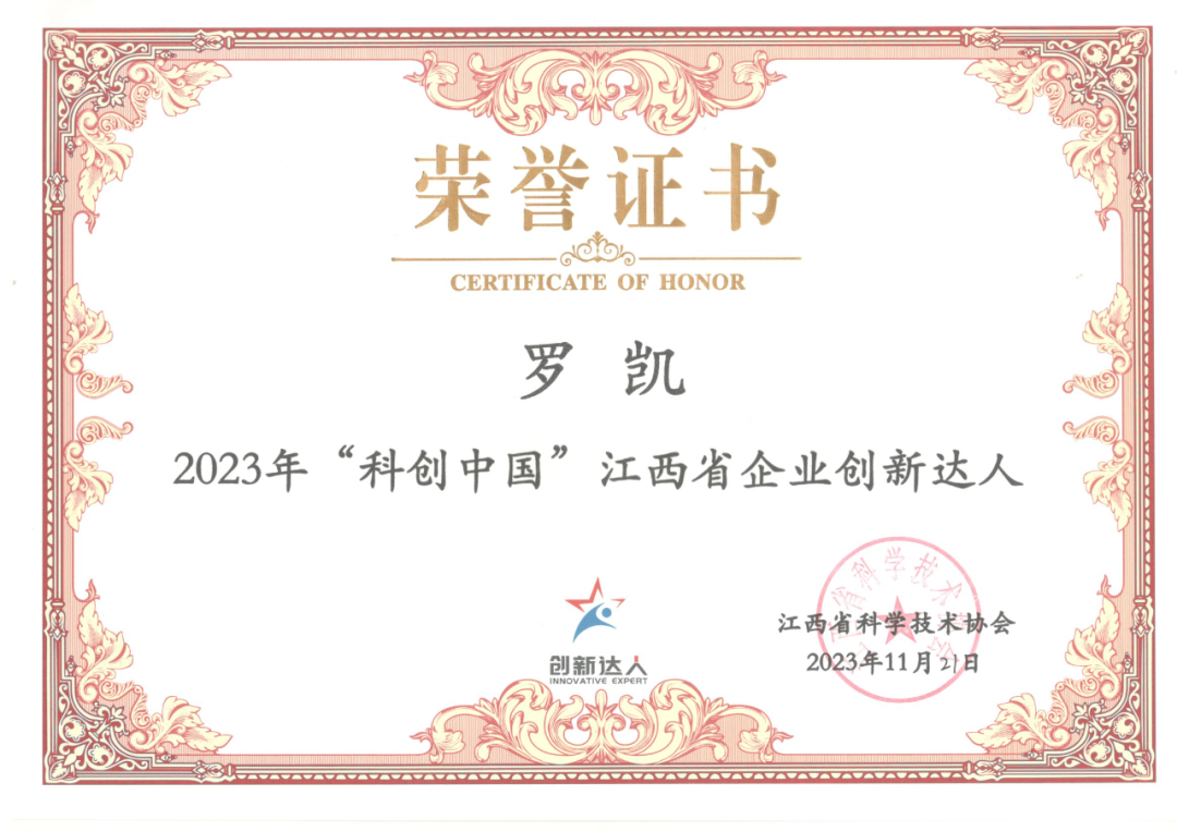 江西省科学技术协会发文公布2023年“科创中国”江西省企业创新达人评选结果,我公司董事长罗凯先生光荣入选。